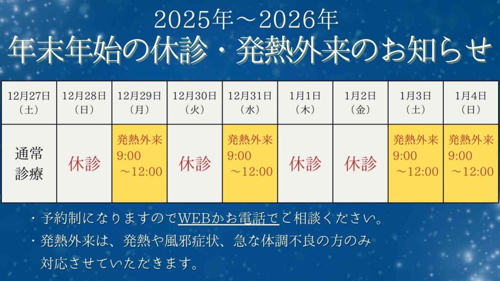 2025年12月28日~2026年1月4日は休診日とさせていただきますが、上記日程で発熱外来を午前診のみさせていただきます。